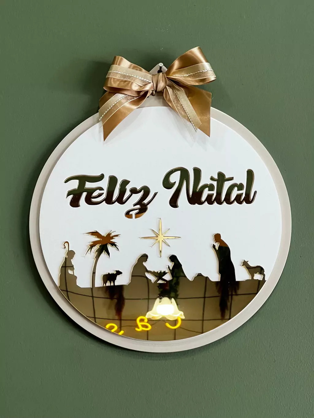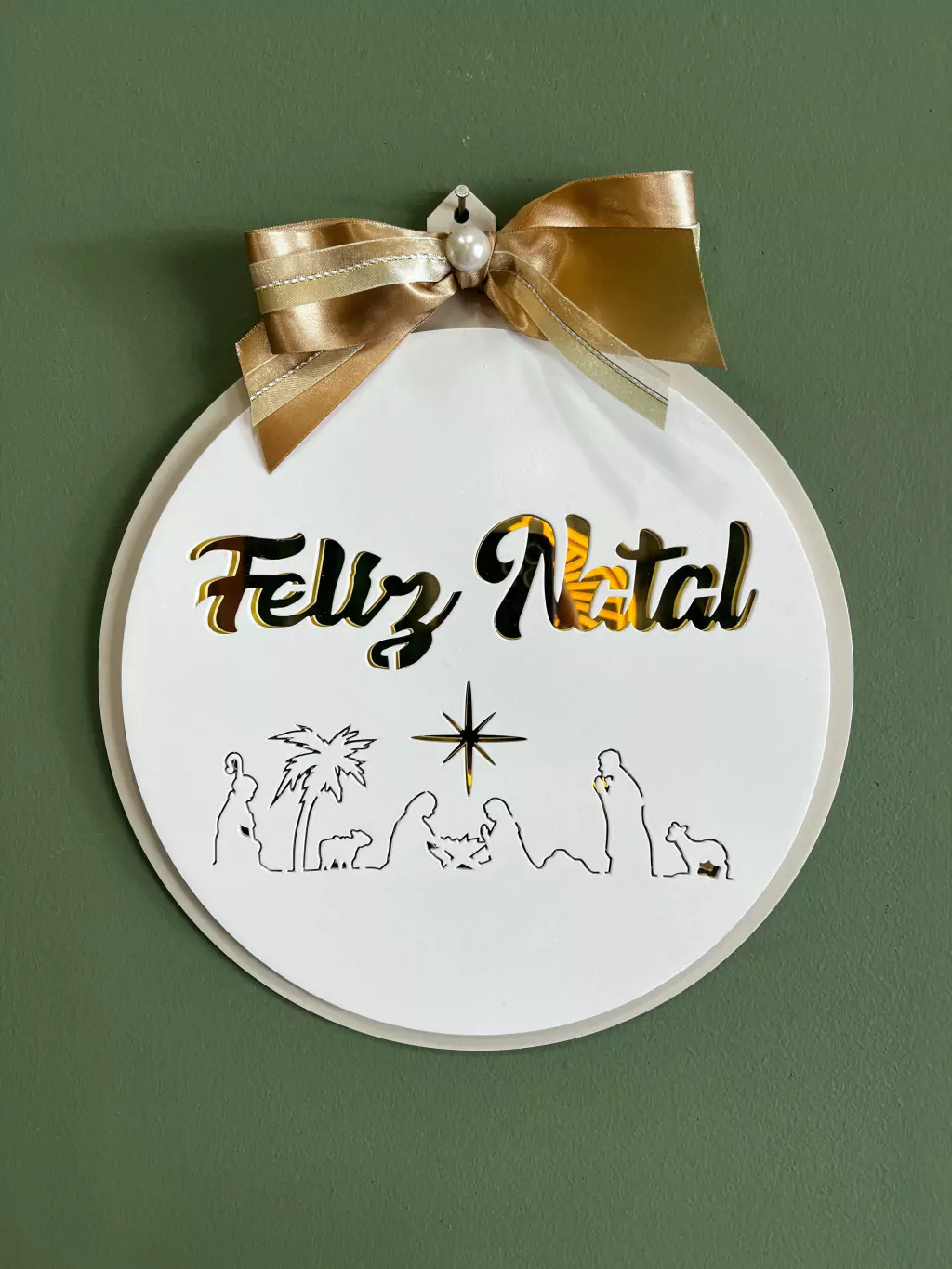 Transforme sua entrada em um verdadeiro espetáculo natalino com nossa placa em MDF, adornada com pintura em laca e detalhes em acrílico espelhado. Com um elegante recorte a laser, a placa exibe as palavras "FELIZ NATAL" e um belíssimo presépio, trazendo um toque especial à sua decoração.