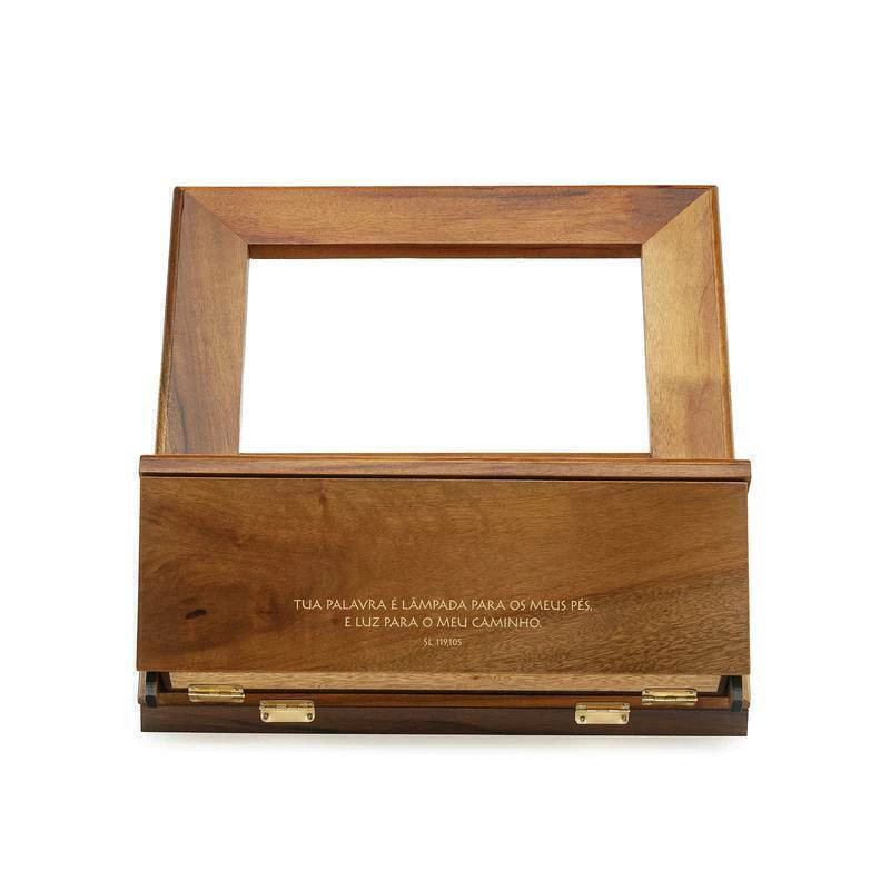 O Porta Bíblia é uma peça encantadora, feito em madeira, que traz um toque de sofisticação e espiritualidade para o seu dia a dia. Com uma gaveta para guardar pequenos itens como terços; este porta bíblia é ideal para proteger e valorizar sua Bíblia.