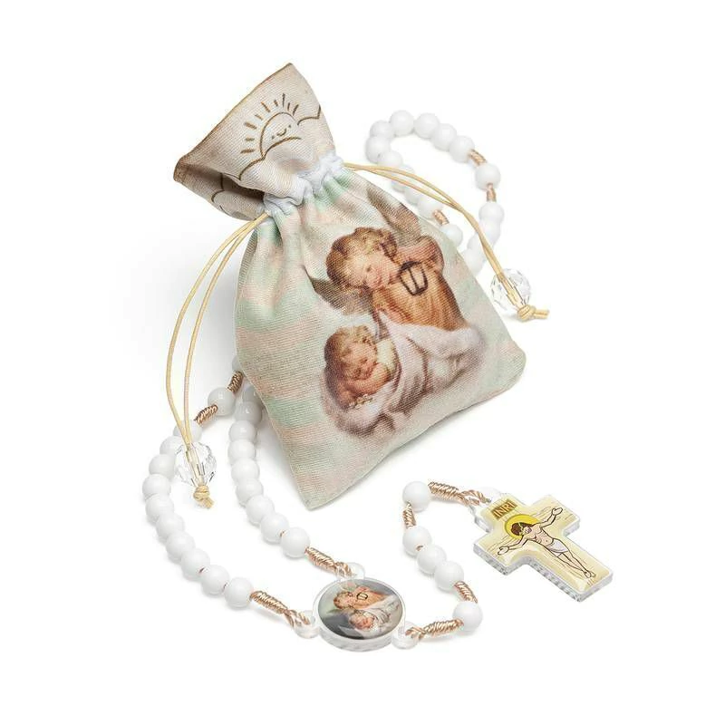 Terço Infantil Anjo da Guarda - 8mm Um terço delicado e elegante, especialmente confeccionado para os pequenos. Feito em acrílico branco polido, com contas de 8mm que proporcionam toque suave e acabamento impecável. A cruz e o entremeio combinam acrílico e resina, garantindo durabilidade e beleza, acompanha saquinho estilizado para guardar/transportar. Ideal para presentear com fé e carinho, celebrando a proteção do Anjo da Guarda.