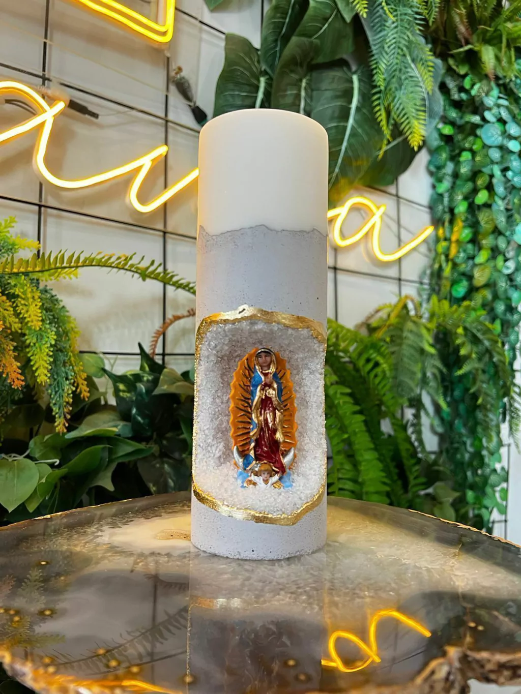 VELA NA BASE DE CIMENTO, ACOMPANHADA Da imagem de nossa senhora de guadalupe, COM DETALHES EM AREIA BRANCA E FOLHAS DE OURO, E PARAFINA VEGETAL DE SOJA.
